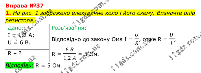 Вправа №37 1. На рис. 1 зображено електричне коло і його схему. Визначте опір резистора. Дано: І = 1,2 А; U = 6 В. Розв’язання: Відповідно до закону Ома І = U/R, отже R = U/I; R = (6 B)/(1,2 A) = 5 Ом. R – ? Відповідь: R = 5 Ом.