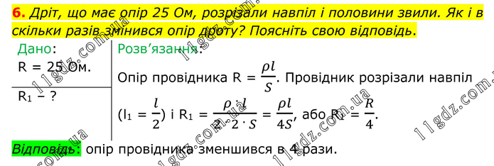 Дріт, що має опір 25 Ом, розрізали навпіл і половини звили. Як і в скільки разів змінився опір дроту? Поясніть свою відповідь. Дано: R = 25 Ом. Розв’язання: Опір провідника R = ρl/S. Провідник розрізали навпіл (l1 = l/2) i R1 = (ρ · l)/(2 · 2 · S) = ρl/4S, або R1 = R/4. R1 – ? Відповідь: опір провідника зменшився в 4 рази.