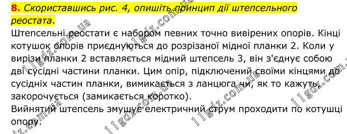 Скориставшись рис. 4, опишіть принцип дії штепсельного реостата. Штепсельні реостати є набором певних точно вивірених опорів. Кінці котушок опорів приєднуються до розрізаної мідної планки 2. Коли у вирізи планки 2 вставляється мідний штепсель 3, він з'єднує собою дві сусідні частини планки. Цим опір, підключений своїми кінцями до сусідніх частин планки, вимикається з ланцюга чи, як то кажуть, закорочується (замикається коротко). Вийнятий штепсель змушує електричний струм проходити по котушці опору.