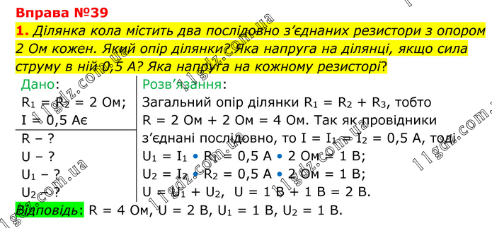Вправа №39 1. Ділянка кола містить два послідовно з’єднаних резистори з опором 2 Ом кожен. Який опір ділянки? Яка напруга на ділянці, якщо сила струму в ній 0,5 А? Яка напруга на кожному резисторі? Дано: R1 = R2 = 2 Ом; I = 0,5 Ає Розв’язання: Загальний опір ділянки R1 = R2 + R3, тобто R = 2 Ом + 2 Ом = 4 Ом. Так як провідники з’єднані послідовно, то І = І1 = І2 = 0,5 А, тоді U1 = I1 • R1 = 0,5 A • 2 Ом = 1 B; U2 = I2 • R2 = 0,5 A • 2 Ом = 1 B; U = U1 + U2, U = 1 B + 1 B = 2 В. R – ? U – ? U1 – ? U2 – ? Відповідь: R = 4 Ом, U = 2 В, U1 = 1 В, U2 = 1 В.