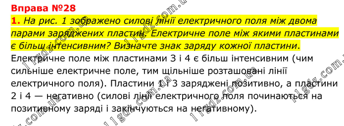 Вправа №28 1. На рис. 1 зображено силові лінії електричного поля між двома парами заряджених пластин. Електричне поле між якими пластинами є більш інтенсивним? Визначте знак заряду кожної пластини. Електричне поле між пластинами З і 4 є більш інтенсивним (чим сильніше електричне поле, тим щільніше розташовані лінії електричного поля). Пластини 1 і 3 заряджені позитивно, а пластини 2 і 4 — негативно (силові лінії електричного поля починаються на позитивному заряді і закінчуються на негативному).