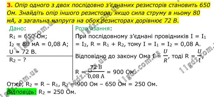 Опір одного з двох послідовно з’єднаних резисторів становить 650 Ом. Знайдіть опір іншого резистора, якщо сила струму в ньому 80 мА, а загальна напруга на обох резисторах дорівнює 72 В. Дано: R1 = 650 Ом; І2 = 80 мА = 0,08 А; U = 72 В. Розв’язання: При послідовному з’єднані провідників І = І1 = І2, R = R1 + R2, тому І = І1 = І2 = 0,08 А. Відповідно до закону Ома I = U/R, тоді R = U/І, R = (72 В)/(0,08 А) = 900 Ом. R2 – ? Отже, R2 = R – R1, R2 = 900 Ом – 650 Ом = 250 Ом. Відповідь: R2 = 250 Ом.