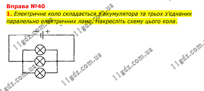 Вправа №40 1. Електричне коло складається з акумулятора та трьох з’єднаних паралельно електричних ламп. Накресліть схему цього кола.