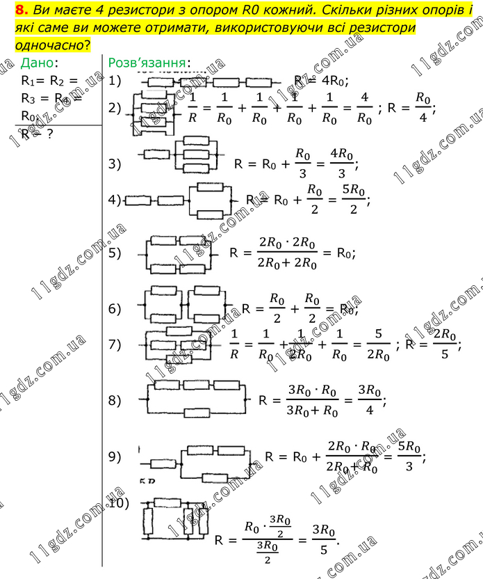 Ви маєте 4 резистори з опором R0 кожний. Скільки різних опорів і які саме ви можете отримати, використовуючи всі резистори одночасно? Дано: R1= R2 = R3 = R4 = R0. Розв’язання: 1) R = 4R0; 2) 1/R = 1/R_0 + 1/R_0 + 1/R_0 + 1/R_0 = 4/R_0 ; R = R_0/4; 3) R = R0 + R_0/3 = 〖4R〗_0/3; 4) R = R0 + R_0/2 = 〖5R〗_0/2; 5) R = (〖2R〗_0 ∙ 〖2R〗_0)/(〖2R〗_0+ 〖2R〗_0 ) = R0; 6) R = R_0/2 + R_0/2 = R0; 7) 1/R = 1/R_0 +1/〖2R〗_0 + 1/R_0 = 5/〖2R〗_0 ; R = 〖2R〗_0/5; 8) R = (〖3R〗_0 ∙ R_0)/(〖3R〗_0+ R_0 ) = 〖3R〗_0/4; 9) R = R0 + (〖2R〗_0 ∙ R_0)/(〖2R〗_0+ R_0 ) = 〖5R〗_0/3; 10) R = (R_0 ∙ 〖3R〗_0/2)/(〖3R〗_0/2) = 〖3R〗_0/5.