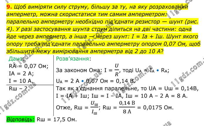 Щоб виміряти силу струму, більшу за ту, на яку розрахований амперметр, можна скористатися тим самим амперметром: паралельно амперметру необхідно під’єднати резистор — шунт (рис. 4). У разі застосування шунта струм ділиться на дві частини: одна йде через амперметр, а інша — через шунт: І = Іа + Іш. Шунт якого опору треба під’єднати паралельно амперметру опором 0,07 Ом, щоб збільшити межу вимірювання амперметра від 2 до 10 А? Дано: RA = 0,07 Ом; IA = 2 А; І = 10 А. Розв’язання: За законом Ома: I = U/R, тоді UA = IA • RA; UA = 2 A • 0,07 Ом = 0,14 В. Так як з’єднання паралельне, то UА = Uш = 0,14B, І = ІА + Іш; Іш = І – ІА, Іш = 10 А – 2 А = 8 А. Отже, Rш = U_ш/I_ш ; Rш = (0,14 В)/(8 А) = 0,0175 Ом. Rш – ? Відповідь: Rш = 17,5 Ом.