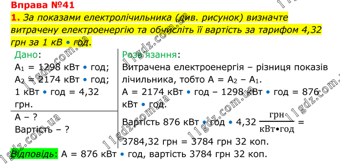 Вправа №41 1. За показами електролічильника (див. рисунок) визначте витрачену електроенергію та обчисліть її вартість за тарифом 4,32 грн за 1 кВ • год. Дано: А1 = 1298 кВт • год; А2 = 2174 кВт • год; 1 кВт • год = 4,32 грн. Розв’язання: Витрачена електроенергія – різниця показів лічильника, тобто А = А2 – А1. А = 2174 кВт • год – 1298 кВт • год = 876 кВт • год. Вартість 876 кВт • год • 4,32 грн/(кВт•год) = 3784,32 грн = 3784 грн 32 коп. А – ? Вартість – ? Відповідь: А = 876 кВт • год, вартість 3784 грн 32 коп.