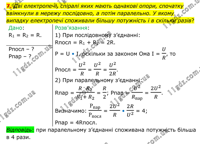 Дві електропечі, спіралі яких мають однакові опори, спочатку ввімкнули в мережу послідовно, а потім паралельно. У якому випадку електропечі споживали більшу потужність і в скільки разів? Дано: R1 = R2 = R. Розв’язання: 1) При послідовному з’єднанні: Rпосл = R1 + R2 = 2R. P = U • I, оскільки за законом Ома І = U/R, то Рпосл = U^2/R = U^2/R = U^2/2R. 2) При паралельному з’єднанні: Rпар = (R · R_2)/(R_1+ R_2 ) = R/2; Рпар = U^2/R_пар = 〖2U〗^2/R. Визначимо: Р_пар/Р_посл = 〖2U〗^2/R • 2R/U^2 = 4; Рпар = 4Rпосл. Рпосл – ? Рпар – ? Відповідь: при паралельному з’єднанні споживана потужність більша в 4 рази.