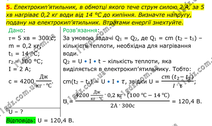 Електрокип’ятильник, в обмотці якого тече струм силою 2 А, за 5 хв нагріває 0,2 кг води від 14 °С до кипіння. Визначте напругу, подану на електрокип’ятильник. Втратами енергії знехтуйте. Дано: τ= 5 хв = 300 с; m = 0,2 кг; t1 = 14 °С; r2 = 100 °С; І = 2 А; с = 4200 Дж/(кг · ℃). Розв’язання: За умовою задачі Q1 = Q2, де Q1 = cm (t2 – t1) – кількість теплоти, необхідна для нагрівання води. Q2 = U • I • t – кількість теплоти, яка виділяється в електрокип’ятильнику. Тобто: cm(t2 – t1) = U • I • τ, звідки U = (cm (t_2- t_1))/(I · τ); U = (4200 Дж/(кг · ℃) · 0,2 кг · (100 ℃ - 14 ℃))/(2А · 300с) = 120,4 В. U – ? Відповідь: U = 120,4 В.