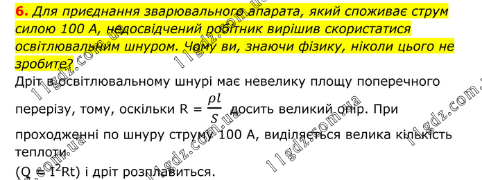 Для приєднання зварювального апарата, який споживає струм силою 100 А, недосвідчений робітник вирішив скористатися освітлювальним шнуром. Чому ви, знаючи фізику, ніколи цього не зробите? Дріт в освітлювальному шнурі має невелику площу поперечного перерізу, тому, оскільки R = ρl/S досить великий опір. При проходженні по шнуру струму 100 А, виділяється велика кількість теплоти (Q = I2Rt) і дріт розплавиться.