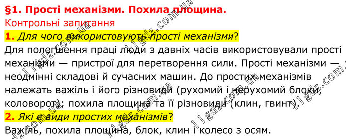 Контрольні запитання 1. Для чого використовують прості механізми? Для полегшення праці люди з давніх часів використовували прості механізми — пристрої для перетворення сили. Прості механізми — неодмінні складові й сучасних машин. До простих механізмів належать важіль і його різновиди (рухомий і нерухомий блоки, коловорот); похила площина та її різновиди (клин, гвинт). 2. Які є види простих механізмів? Важіль, похила площина, блок, клин і колесо з осям.