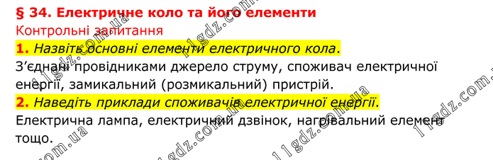 § 34. Електричне коло та його елементи Контрольні запитання 1. Назвіть основні елементи електричного кола. З’єднані провідниками джерело струму, споживач електричної енергії, замикальний (розмикальний) пристрій. 2. Наведіть приклади споживачів електричної енергії. Електрична лампа, електричний дзвінок, нагрівальний елемент тощо.