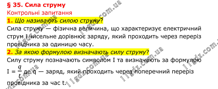 § 35. Сила струму Контрольні запитання 1. Що називають силою струму? Сила струму — фізична величина, що характеризує електричний струм і чисельне дорівнює заряду, який проходить через переріз провідника за одиницю часу. 2. За якою формулою визначають силу струму? Силу струму позначають символом I та визначають за формулою I = q/t де q — заряд, який проходить через поперечний переріз провідника за час t.