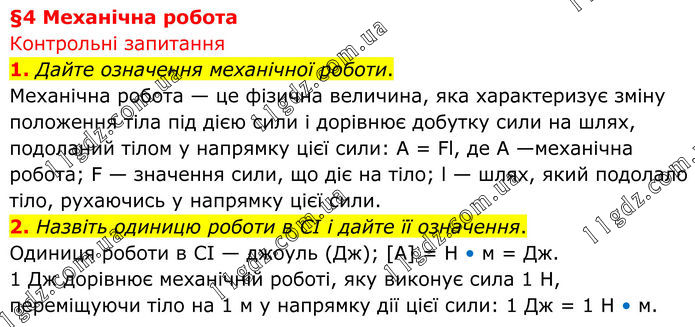 Контрольні запитання 1. Дайте означення механічної роботи. Механічна робота — це фізична величина, яка характеризує зміну положення тіла під дією сили і дорівнює добутку сили на шлях, подоланий тілом у напрямку цієї сили: А = Fl, де А —механічна робота; F — значення сили, що діє на тіло; l — шлях, який подолало тіло, рухаючись у напрямку цієї сили. 2. Назвіть одиницю роботи в СІ і дайте її означення. Одиниця роботи в СІ — джоуль (Дж); [А] = Н • м = Дж. 1 Дж дорівнює механічній роботі, яку виконує сила 1 Н, переміщуючи тіло на 1 м у напрямку дії цієї сили: 1 Дж = 1 Н • м.