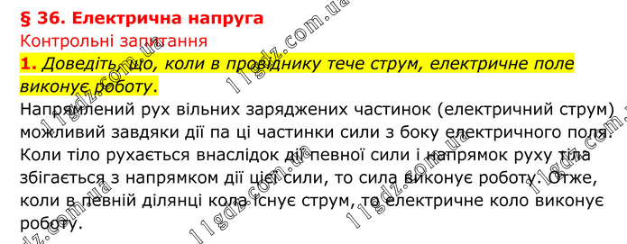 § 36. Електрична напруга Контрольні запитання 1. Доведіть, що, коли в провіднику тече струм, електричне поле виконує роботу. Напрямлений рух вільних заряджених частинок (електричний струм) можливий завдяки дії па ці частинки сили з боку електричного поля. Коли тіло рухається внаслідок дії певної сили і напрямок руху тіла збігається з напрямком дії цієї сили, то сила виконує роботу. Отже, коли в певній ділянці кола існує струм, то електричне коло виконує роботу.