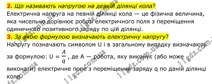 2. Що називають напругою на деякій ділянці кола? Електрична напруга на певній ділянці кола — це фізична величина, яка чисельно дорівнює роботі електричного поля з переміщення одиничного позитивного заряду по цій ділянці. 3. За якою формулою визначають електричну напругу? Напругу позначають символом U і в загальному випадку визначають за формулою: U = A/q , де А — робота, яку виконує (або може виконати) електричне поле з переміщення заряду q по даній ділянці кола.