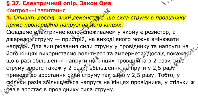 § 37. Електричний опір. Закон Ома Контрольні запитання 1. Опишіть дослід, який демонструє, що сила струму в провіднику прямо пропорційна напрузі на його кінцях. Складемо електричне коло, споживачем у якому є резистор, а джерелом струму — пристрій, на виході якого можна змінювати напругу. Для вимірювання сили струму у провіднику та напруги на його кінцях використаємо вольтметр та амперметр. Дослід покаже, що в разі збільшення напруги на кінцях провідника в 2 рази сила струму зросте також у 2 рази; збільшення на пруги у 2,5 разу приведе до зростання сили струму так само у 2,5 разу. Тобто, у скільки разів збільшується напруга на кінцях провідника, у стільки ж разів зростає в провіднику сила струму.