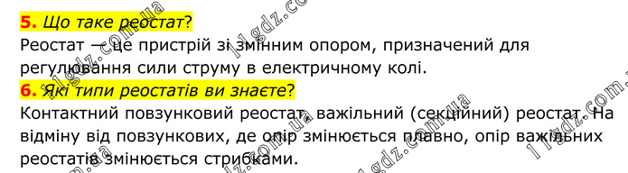 5. Що таке реостат? Реостат — це пристрій зі змінним опором, призначений для регулювання сили струму в електричному колі. 6. Які типи реостатів ви знаєте? Контактний повзунковий реостат, важільний (секційний) реостат. На відміну від повзункових, де опір змінюється плавно, опір важільних реостатів змінюється стрибками.