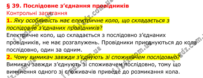§ 39. Послідовне з’єднання провідників Контрольні запитання 1. Яку особливість має електричне коло, що складається з послідовно з’єднаних провідників? Електричне коло, що складається з послідовно з’єднаних провідників, не має розгалужень. Провідники приєднуються до кола послідовно, один за одним. 2. Чому вимикач завжди з’єднують зі споживачем послідовно? Вимикач завжди з’єднують зі споживачем послідовно, тому що вимкнення одного зі споживачів приведе до розмикання кола.