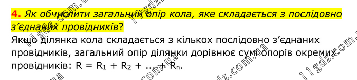 4. Як обчислити загальний опір кола, яке складається з послідовно з’єднаних провідників? Якщо ділянка кола складається з кількох послідовно з’єднаних провідників, загальний опір ділянки дорівнює сумі опорів окремих провідників: R = R1 + R2 + ... + Rn.