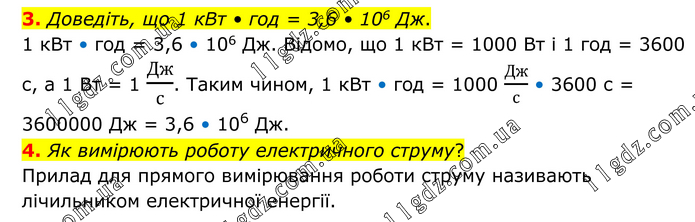 3. Доведіть, що 1 кВт • год = 3,6 • 106 Дж. 1 кВт • год = 3,6 • 106 Дж. Відомо, що 1 кВт = 1000 Вт і 1 год = 3600 с, а 1 Вт = 1 Дж/с. Таким чином, 1 кВт • год = 1000 Дж/с • 3600 с = 3600000 Дж = 3,6 • 106 Дж. 4. Як вимірюють роботу електричного струму? Прилад для прямого вимірювання роботи струму називають лічильником електричної енергії.