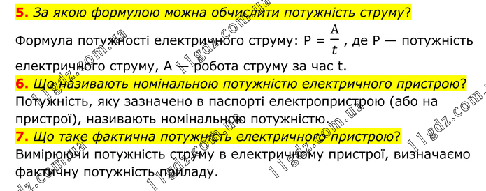 5. За якою формулою можна обчислити потужність струму? Формула потужності електричного струму: Р = А/t , де Р — потужність електричного струму, А — робота струму за час t. 6. Що називають номінальною потужністю електричного пристрою? Потужність, яку зазначено в паспорті електропристрою (або на пристрої), називають номінальною потужністю. 7. Що таке фактична потужність електричного пристрою? Вимірюючи потужність струму в електричному пристрої, визначаємо фактичну потужність приладу.
