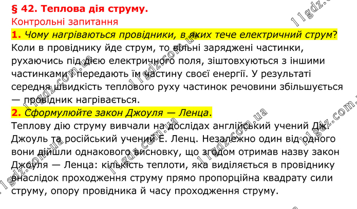 § 42. Теплова дія струму. Контрольні запитання 1. Чому нагріваються провідники, в яких тече електричний струм? Коли в провіднику йде струм, то вільні заряджені частинки, рухаючись під дією електричного поля, зіштовхуються з іншими частинками і передають їм частину своєї енергії. У результаті середня швидкість теплового руху частинок речовини збільшується — провідник нагрівається. 2. Сформулюйте закон Джоуля — Ленца. Теплову дію струму вивчали на дослідах англійський учений Дж. Джоуль та російський учений Е. Ленц. Незалежно один від одного вони дійшли однакового висновку, що згодом отримав назву закон Джоуля — Ленца: кількість теплоти, яка виділяється в провіднику внаслідок проходження струму прямо пропорційна квадрату сили струму, опору провідника й часу проходження струму.
