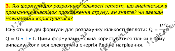 3. Які формули для розрахунку кількості теплоти, що виділяється в провіднику внаслідок проходження струму, ви знаєте? Чи завжди можна ними користуватися? Існують ще дві формули для розрахунку кількості теплоти: Q = (U^2 t)/R Q = U • I • t. Цими формулами можна користуватися тільки в тому випадку, коли вся електрична енергія йде на нагрівання.