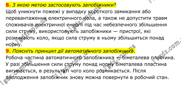 8. З якою метою застосовують запобіжники? Щоб уникнути пожежі у випадку короткого замикання або перевантаження електричного кола, а також не допустити травм споживачів електричної енергії під час небезпечного збільшення сили струму, використовують запобіжники — пристрої, які розмикають коло, якщо сила струму в ньому збільшиться понад норму. 9. Поясніть принцип дії автоматичного запобіжника. Робоча частина автоматичного запобіжника — біметалева пластина. У разі збільшення сили струму понад норму біметалева пластина вигинається, в результаті чого коло розмикається. Після охолодження запобіжник знову можна повернути в робочий стан.