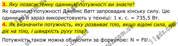 3. Яку позасистемну одиницю потужності ви знаєте? Як одиницю потужності Джеймс Ватт запровадив кінську силу. Цю одиницю й зараз використовують у техніці: 1 к. с. = 735,5 Вт. 4. Як визначити потужність, яку розвиває тіло, якщо відомі сила, що діє на тіло, і швидкість руху тіла? Потужність також можна обчислити за формулою: N = Fυ.