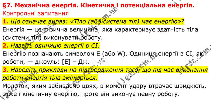 Контрольні запитання 1. Що означає вираз: «Тіло (або система тіл) має енергію»? Енергія — це фізична величина, яка характеризує здатність тіла (системи тіл) виконувати роботу. 2. Назвіть одиницю енергії в СІ. Енергію позначають символом Е (або W). Одиниця енергії в СІ, як і роботи, — джоуль: [Е] – Дж. 3. Наведіть приклади на підтвердження того, що під час виконання роботи енергія тіла змінюється. Молоток, яким забиваємо цвях, в момент удару втрачає швидкість, отже і кінетичну енергію, проте він виконує певну роботу.