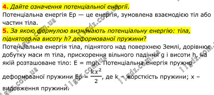 4. Дайте означення потенціальної енергії. Потенціальна енергія Ер — це енергія, зумовлена взаємодією тіл або частин тіла. 5. За якою формулою визначають потенціальну енергію: тіла, піднятого на висоту h? деформованої пружини? Потенціальна енергія тіла, піднятого над поверхнею Землі, дорівнює добутку маси m тіла, прискорення вільного падіння g і висоти h, на якій розташоване тіло: Е = mgh. Потенціальна енергія пружно деформованої пружини Ер = (kx^2)/2, де k – жорсткість пружини; х – видовження пружини.