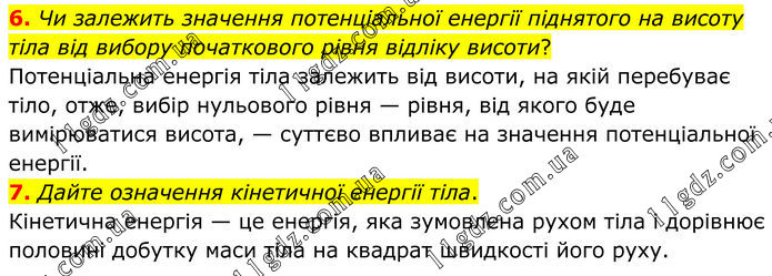 6. Чи залежить значення потенціальної енергії піднятого на висоту тіла від вибору початкового рівня відліку висоти? Потенціальна енергія тіла залежить від висоти, на якій перебуває тіло, отже, вибір нульового рівня — рівня, від якого буде вимірюватися висота, — суттєво впливає на значення потенціальної енергії. 7. Дайте означення кінетичної енергії тіла. Кінетична енергія — це енергія, яка зумовлена рухом тіла і дорівнює половині добутку маси тіла на квадрат швидкості його руху.