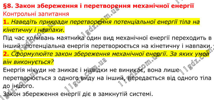 Контрольні запитання 1. Наведіть приклади перетворення потенціальної енергії тіла на кінетичну і навпаки. Під час коливань маятника один вид механічної енергії переходить в інший: потенціальна енергія перетворюється на кінетичну і навпаки. 2. Сформулюйте закон збереження механічної енергії. За яких умов він виконується? Енергія нікуди не зникає і нізвідки не виникає, вона лише перетворюється з одного виду на інший, передається від одного тіла до іншого. Закон збереження енергії діє в замкнутій системі.