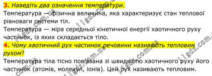 3. Наведіть два означення температури. Температура — фізична величина, яка характеризує стан теплової рівно¬ваги системи тіл. Температура — міра середньої кінетич¬ної енергії хаотичного руху частинок, із яких складається тіло. 4. Чому хаотичний рух частинок речовини називають тепловим рухом? Температура тіла тісно пов’язана зі швидкістю хаотичного руху його час¬тинок (атомів, молекул, іонів). Цей рух називають тепловим.