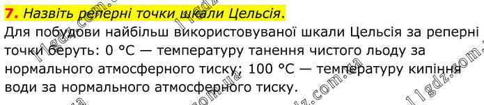 7. Назвіть реперні точки шкали Цельсія. Для побудови найбільш використову¬ваної шкали Цельсія за реперні точки беруть: 0 °С — температуру танення чистого льоду за нормального атмосферного тиску; 100 °С — температуру кипіння води за нормального атмосферного тиску.