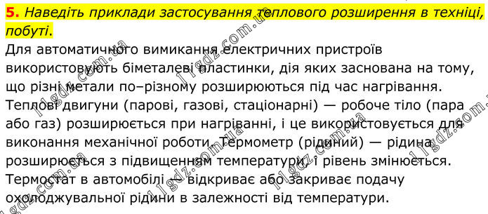 5. Наведіть приклади застосування теплового розширення в техніці, побуті. Для автоматичного вимикання електричних пристроїв використовують біметалеві пластинки, дія яких заснована на тому, що різні метали по–різному розширюються під час нагрівання. Теплові двигуни (парові, газові, стаціонарні) — робоче тіло (пара або газ) розширюється при нагріванні, і це використовується для виконання механічної роботи. Термометр (рідиний) — рідина розширюється з підвищенням температури, і рівень змінюється. Термостат в автомобілі — відкриває або закриває подачу охолоджувальної рідини в залежності від температури.