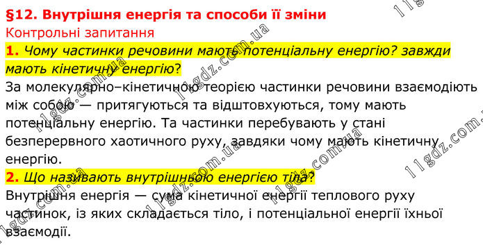 Контрольні запитання 1. Чому частинки речовини мають потенціальну енергію? завжди мають кінетичну енергію? За молекулярно–кінетичною теорією частинки речовини взаємодіють між со¬бою — притягуються та відштовхують¬ся, тому мають потенціальну енергію. Та частинки перебувають у стані безперервного хаотичного руху, завдяки чому мають кінетичну енергію. 2. Що називають внутрішньою енергією тіла? Внутрішня енергія — сума кінетич¬ної енергії теплового руху частинок, із яких складається тіло, і потенціальної енергії їхньої взаємодії.