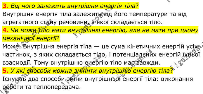 3. Від чого залежить внутрішня енергія тіла? Внутрішня енергія тіла залежить від його температури та від агрегатного ста¬ну речовини, з якої складається тіло. 4. Чи може тіло мати внутрішню енергію, але не мати при цьому механічної енергії? Може. Внутрішня енергія тіла — це сума кінетичних енергій усіх частинок, з яких складається тіло, і потенціаль¬них енергій їхньої взаємодії. Тому вну¬трішню енергію тіло має завжди. 5. У які способи можна змінити внутрішню енергію тіла? Існують два способи зміни внутріш¬ньої енергії тіла: виконання роботи та теплопередача.