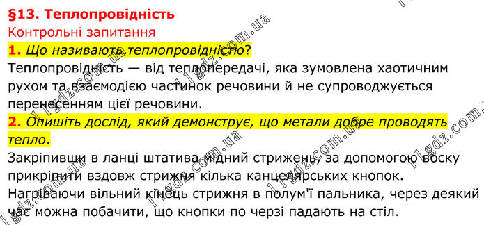 §13. Теплопровідність Контрольні запитання 1. Що називають теплопровідністю? Теплопровідність — від теплопере¬дачі, яка зумовлена хаотичним рухом та взаємодією частинок речовини й не супроводжується перенесенням цієї ре¬човини. 2. Опишіть дослід, який демонструє, що метали добре проводять тепло. Закріпивши в ланці штатива мідний стрижень, за допомогою воску прикрі¬пити вздовж стрижня кілька канцеляр¬ських кнопок. Нагріваючи вільний кі¬нець стрижня в полум'ї пальника, через деякий час можна побачити, що кнопки по черзі падають на стіл.