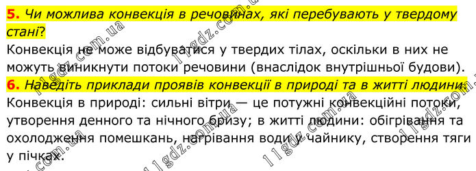 5. Чи можлива конвекція в речовинах, які перебувають у твердому стані? Конвекція не може відбуватися у твердих тілах, оскільки в них не мо¬жуть виникнути потоки речовини (внас¬лідок внутрішньої будови). 6. Наведіть приклади проявів конвекції в природі та в житті людини. Конвекція в природі: сильні вітри — це потужні конвекційні потоки, утво¬рення денного та нічного бризу; в житті людини: обігрівання та охолодження помешкань, нагрівання води у чайнику, створення тяги у пічках.