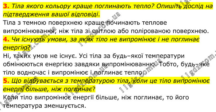 3. Тіла якого кольору краще поглинають тепло? Опишіть дослід на підтвердження вашої відповіді. Тіла з темною поверхнею краще по¬чинають теплове випромінювання, ніж тіла зі світлою або полірованою поверх¬нею. 4. Чи існують умови, за яких тіло не випромінює і не поглинає енергію? Ні, таких умов не існує. Усі тіла за будь–якої температури обмінюються енергією завдяки випромі¬нюванню. Тобто, будь–яке тіло водночас і випромінює і поглинає тепло. 5. Що відбувається з температурою тіла, коли це тіло випромінює енергії більше, ніж поглинає? Коли тіло випромінює енергії більше, ніж поглинає, то його температура зменшується.