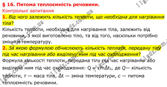 § 16. Питома теплоємність речовини. Контрольні запитання 1. Від чого залежить кількість теплоти, що необхідна для нагрівання тіла? Кількість теплоти, необхідна для нагрівання тіла, залежить від речовини, з якої виготовлено тіло, та від того, наскільки потрібно змінити температуру. 2. За якою формулою обчислюють кількість теплоти, передану тілу під час нагрівання або виділену ним під час охолодження? Формула кількості теплоти, передана тілу під час нагрівання або виділена ним під час охолодження: Q = cm∆t1, де Q— кількість теплоти, т — маса тіла, ∆t — зміна температури, с — питома теплоємність речовини.