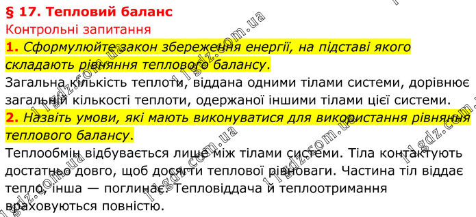§ 17. Тепловий баланс Контрольні запитання 1. Сформулюйте закон збереження енергії, на підставі якого складають рівняння теплового балансу. Загальна кількість теплоти, віддана одними тілами системи, дорівнює за¬гальній кількості теплоти, одержаної іншими тілами цієї системи. 2. Назвіть умови, які мають виконуватися для використання рівняння теплового балансу. Теплообмін відбувається лише між тілами системи. Тіла контактують достатньо довго, щоб досягти теплової рівноваги. Частина тіл віддає тепло, інша — поглинає. Тепловіддача й теплоотримання враховуються повністю.