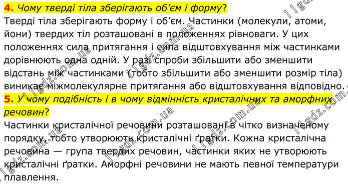 4. Чому тверді тіла зберігають об’єм і форму? Тверді тіла зберігають форму і об’єм. Частинки (молекули, атоми, йони) твердих тіл розташовані в положеннях рівноваги. У цих положеннях сила притягання і сила відштовхування між частинками дорівнюють одна одній. У разі спроби збільшити або зменшити відстань між частинками (тобто збіль¬шити або зменшити розмір тіла) вини¬кає міжмолекулярне притягання або відштовхування відповідно. 5. У чому подібність і в чому відмінність кристалічних та аморфних речовин? Частинки кристалічної речовини роз¬ташовані в чітко визначеному порядку, тобто утворюють кристалічні ґратки. Кожна кристалічна речовина — гру¬па твердих речовин, частинки яких не утворюють кристалічні ґратки. Аморф¬ні речовини не мають певної температу¬ри плавлення.