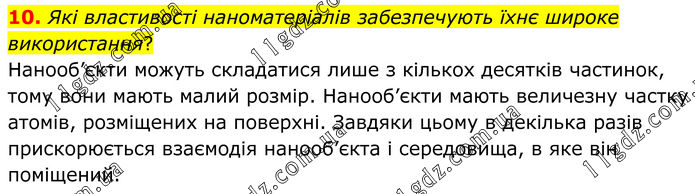 10. Які властивості наноматеріалів забезпечують їхнє широке використання? Нанооб’єкти можуть складатися лише з кількох десятків частинок, тому вони мають малий розмір. Нанооб’єкти мають величезну частку атомів, розмі¬щених на поверхні. Завдяки цьому в декілька разів прискорюється взаємо¬дія нанооб’єкта і середовища, в яке він поміщений.