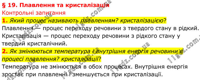 § 19. Плавлення та кристалізація Контрольні запитання 1. Який процес називають плавленням? кристалізацією? Плавлення — процес переходу речо¬вини з твердого стану в рідкий. Кристалізація — процес переходу речовини з рідкого стану у твердий кристалічний. 2. Як змінюються температура і внутрішня енергія речовини в процесі плавлення? кристалізації? Температура не змінюється в обох процесах. Внутрішня енергія зростає при плавленні і зменшується при кристалізації.