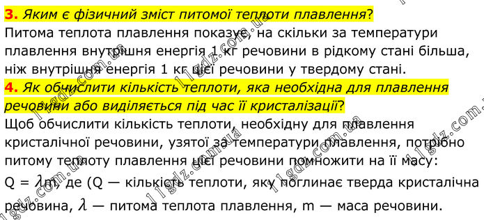 3. Яким є фізичний зміст питомої теплоти плавлення? Питома теплота плавлення показує, на скільки за температури плавлення внутрішня енергія 1 кг речовини в рід¬кому стані більша, ніж внутрішня енер¬гія 1 кг цієї речовини у твердому стані. 4. Як обчислити кількість теплоти, яка необхідна для плавлення речовини або виділяється під час її кристалізації? Щоб обчислити кількість теплоти, не¬обхідну для плавлення кристалічної ре¬човини, узятої за температури плавлен¬ня, потрібно питому теплоту плавлення цієї речовини помножити на її масу: Q = λm, де (Q — кількість теплоти, яку поглинає тверда кристалічна речовина, λ — питома теплота плавлення, m — маса речовини.