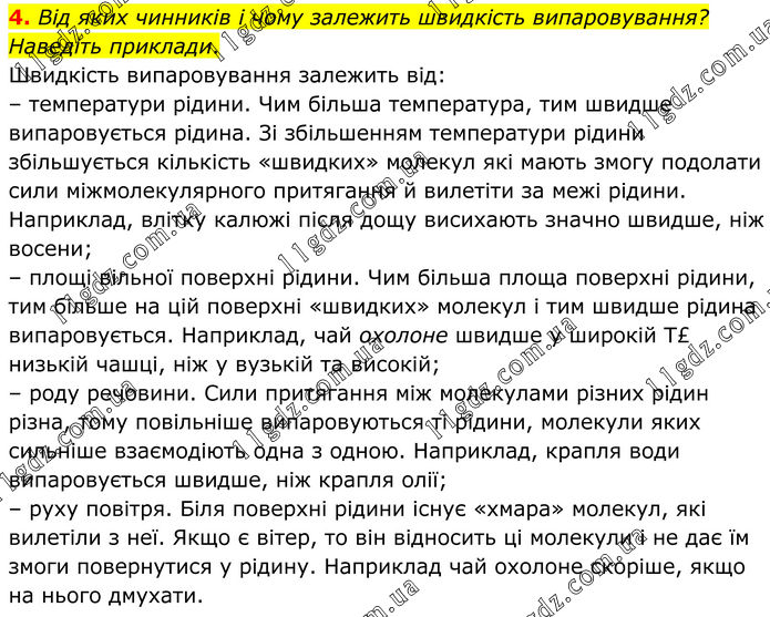 4. Від яких чинників і чому залежить швидкість випаровування? Наведіть приклади. Швидкість випаровування залежить від: – температури рідини. Чим більша температура, тим швидше випаровуєть¬ся рідина. Зі збільшенням температури рідини збільшується кількість «швид¬ких» молекул які мають змогу подола¬ти сили міжмолекулярного притягання й вилетіти за межі рідини. Наприклад, влітку калюжі після дощу висихають значно швидше, ніж восени; – площі вільної поверхні рідини. Чим більша площа поверхні рідини, тим більше на цій поверхні «швидких» мо¬лекул і тим швидше рідина випарову¬ється. Наприклад, чай охолоне швид¬ше у широкій Т£ низькій чашці, ніж у вузькій та високій; – роду речовини. Сили притягання між молекулами різних рідин різна, тому повільніше випаровуються ті рідини, молекули яких сильніше взаємодіють одна з одною. Наприклад, крапля во¬ди випаровується швидше, ніж крапля олії; – руху повітря. Біля поверхні рідини існує «хмара» молекул, які вилетіли з неї. Якщо є вітер, то він відносить ці молекули і не дає їм змоги поверну¬тися у рідину. Наприклад чай охолоне скоріше, якщо на нього дмухати.