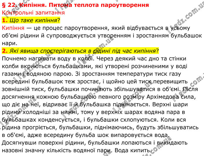 § 22. Кипіння. Питома теплота пароутворення Контрольні запитання 1. Що таке кипіння? Кипіння — це процес пароутворен¬ня, який відбувається в усьому об’ємі рідини й супроводжується утворенням і зростанням бульбашок нари. 2. Які явища спостерігаються в рідині під час кипіння? Почнемо нагрівати воду в колбі. Через деякий час дно та стінки колби вкриються бульбашками, які утворені розчиненими у воді газами і водяною парою. Зі зростанням температури тиск газу всередині бульбашок теж зростає, і щойно цей тиск перевищить зовнішній тиск, бульбашки починають збільшува¬тися в об’ємі. Після досягнення кожною бульбашкою певного розміру Архімедова сила, що діє на неї, відриває її й буль¬башка піднімається. Верхні шари ріди¬ни холодніші за нижні, тому у верхніх шарах водяна пара в бульбашках кон¬денсується, і бульбашки схлопуються. Коли вся рідина прогріється, бульбаш¬ки, піднімаючись, будуть збільшува¬тись в об'ємі, адже всередину бульба¬ шок випаровується вода. Досягнувши поверхні рідини, бульбашки лопаються і викидають назовні значну кількість водяної пари. Вода кипить.