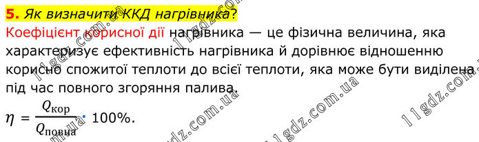 5. Як визначити ККД нагрівника? Коефіцієнт корисної дії нагрівника — це фізична величина, яка характеризує ефективність нагрівника й дорівнює відношенню корисно спожитої теплоти до всієї теплоти, яка може бути виділена під час повного згоряння палива. η = Q_кор/Q_повна · 100%.
